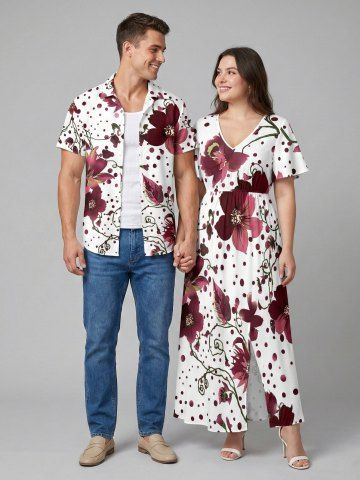 Tenues Hawaïennes Assorties > Ensemble de plage hawaïen assorti pour couples, imprimé fleurs et feuilles, grandes tailles