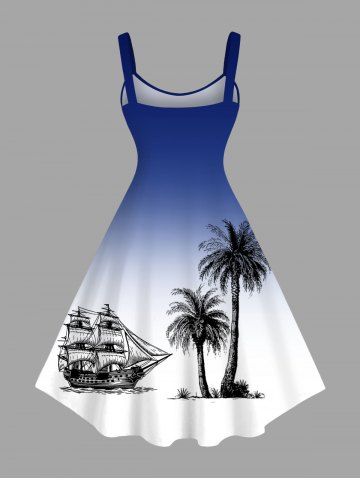 Ensemble de plage hawaïen assorti pour couples, imprimé ombré cocotier et voilier, grandes tailles - Bleu Marine - Bleu Marin