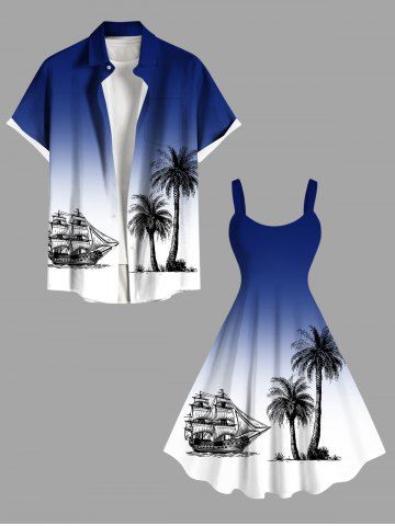 Tenues Hawaïennes Assorties> Ensemble de plage hawaïen assorti pour couples, imprimé ombré cocotier et voilier, grandes tailles