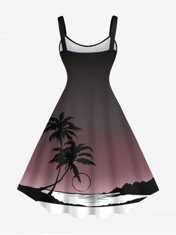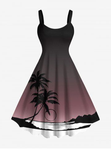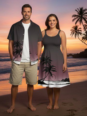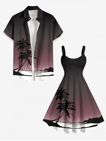 Tenues Hawaïennes Assorties> Ensemble de plage hawaïen assorti pour couples, imprimé ombré paysage marin et cocotiers, grandes tailles