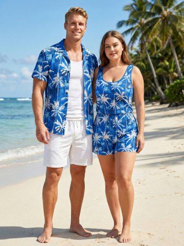 Tenues Hawaïennes Assorties > Ensemble hawaïen assorti chemise et barboteuse grande taille imprimé cocotier pour couples