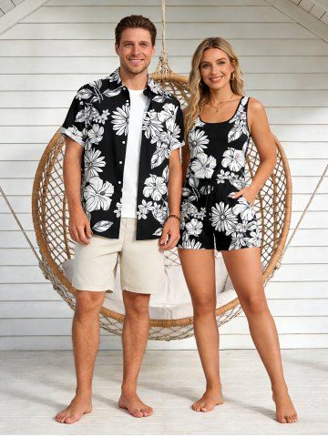 Ensemble hawaïen assorti chemise et barboteuse grande taille, tenue de plage à imprimé feuilles et hibiscus pour couples - Noir - Noir