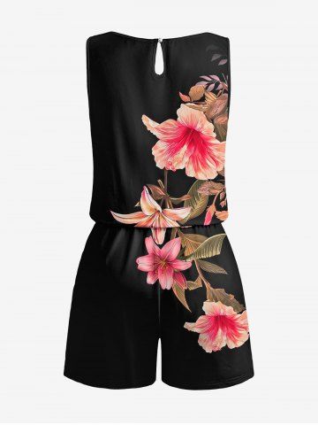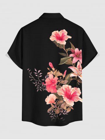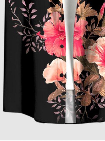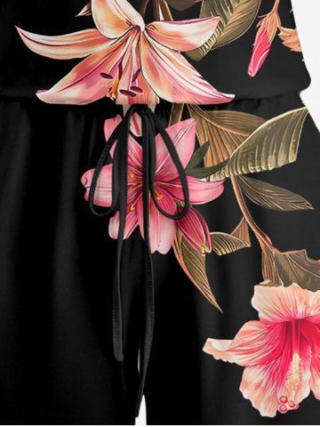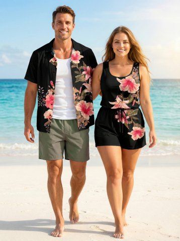 Ensemble hawaïen assorti chemise et barboteuse grande taille, tenue de plage à imprimé feuilles tropicales et hibiscus pour couples - Noir - Noir