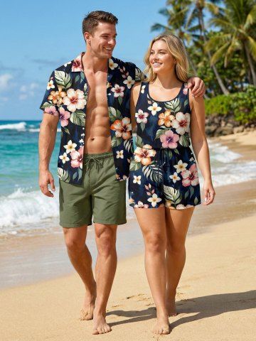 Tenues Hawaïennes Assorties> Ensemble hawaïen assorti chemise et barboteuse grande taille, tenue de plage à imprimé floral tropical et hibiscus pour couples