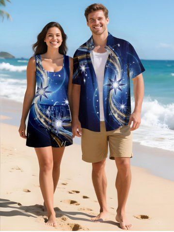 Tenues Hawaïennes Assorties> Ensemble hawaïen assorti chemise et barboteuse grande taille, tenue de plage à imprimé galaxie ombré étoilé pour couples