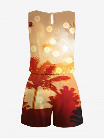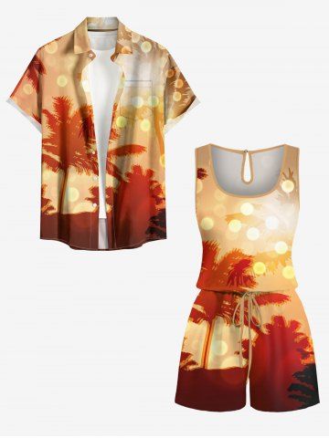 Tenues Hawaïennes Assorties> Ensemble hawaïen assorti chemise et barboteuse grande taille, tenue de plage imprimée cocotiers et pois lumineux pour couples