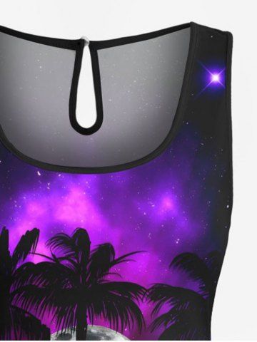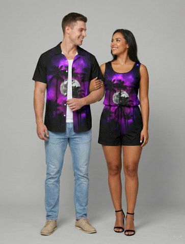 Tenues Hawaïennes Assorties> Ensemble hawaïen assorti chemise et barboteuse grande taille, tenue de plage imprimée cocotiers, galaxie et lune pour couples