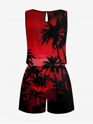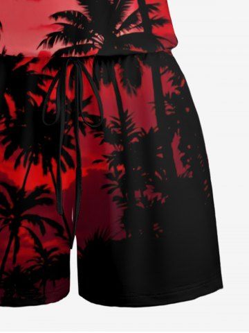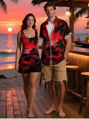 Ensemble hawaïen assorti chemise et barboteuse grande taille, tenue de plage pour couples, imprimé ciel ombré et cocotiers - Rouge - Rouge