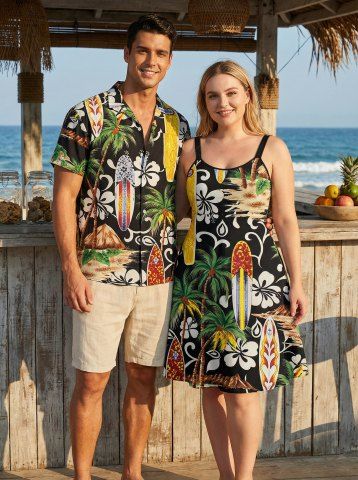 Tenues Hawaïennes Assorties> Ensemble de plage hawaïen assorti pour couples, imprimé ethnique fleurs de cocotier, grandes tailles