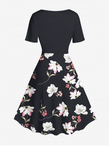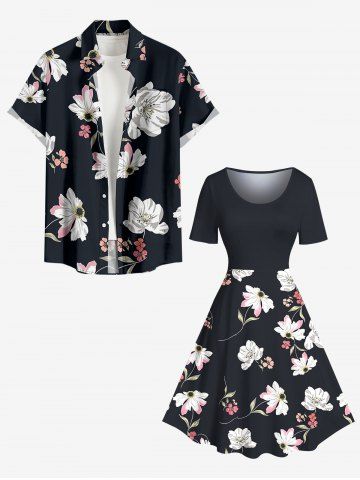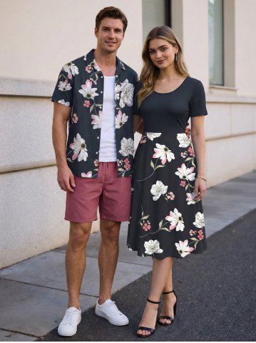 Flowers Leaf Print Plus Size Matching Hawaii Beach Outfit For Couples - Noir - Noir