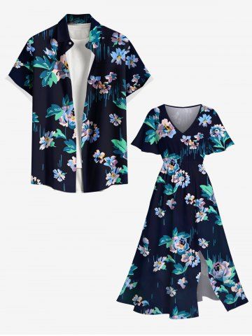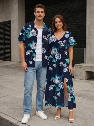 Tenues Hawaïennes Assorties > Flowers Leaf Print Plus Size Matching Hawaii Beach Outfit For Couples