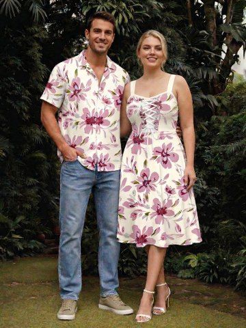 Flowers Leaf Print Plus Size Matching Hawaii Beach Outfit For Couples - Rose - Rose