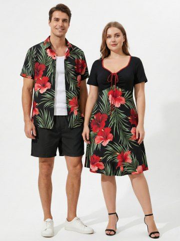Tenues Hawaïennes Assorties> Hibiscus Flower Tropical Leaf Print Plus Size Matching Hawaii Beach Outfit For Couples