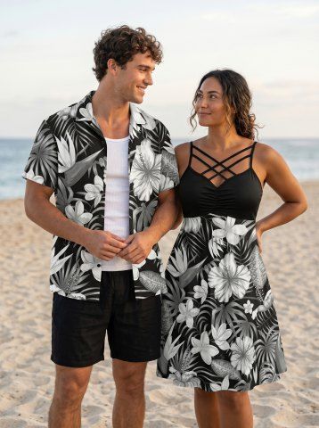 Tenues Hawaïennes Assorties> Hibiscus Flower Tropical Leaf Print Plus Size Matching Hawaii Beach Outfit For Couples