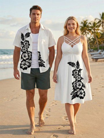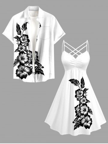 Hibiscus Flowers Leaf Print Plus Size Matching Hawaii Beach Outfit For Couples - Blanc - Blanc