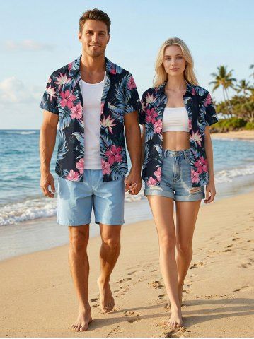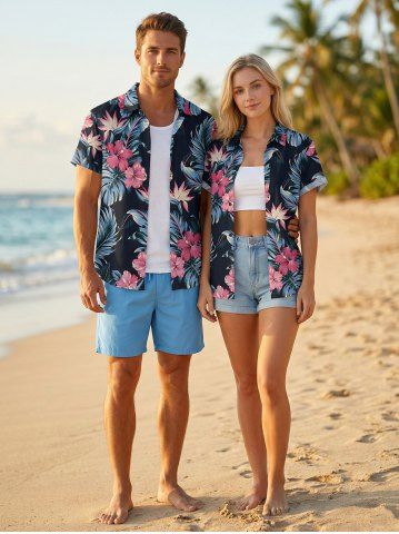 Tenues Hawaïennes Assorties> Hibiscus Flowers Tropical Leaf Print Plus Size Matching Hawaii Beach Outfit For Couples