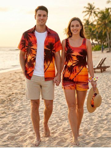 Tenues Hawaïennes Assorties> Matching Hawaii Shirt and Romper Plus Size Beach Outfit Coconut Tree Ombre Dusk Print For Couples