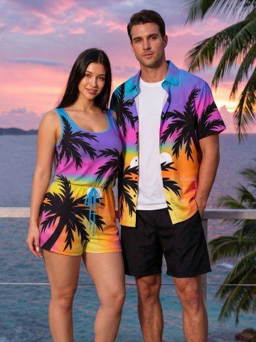 Tenues Hawaïennes Assorties> Matching Hawaii Shirt and Romper Plus Size Beach Outfit Coconut Tree Sun Ombre Print for Couples