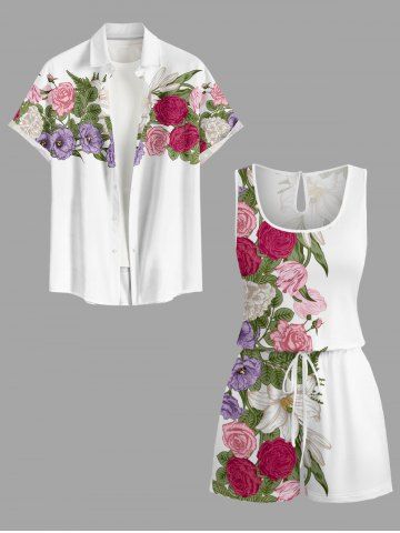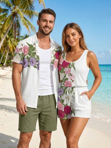 Matching Hawaii Shirt and Romper Plus Size Beach Outfit Flower Leaf Print For Couples - Blanc - Blanc