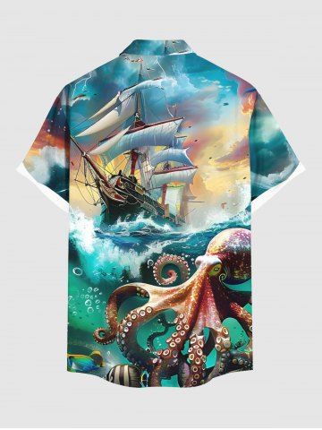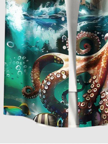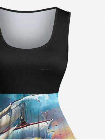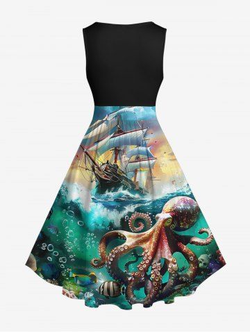 Robe Trapèze Ombrée à Imprimé Voilier et Pieuvre dans la Plage Grande Taille - Noir - Noir