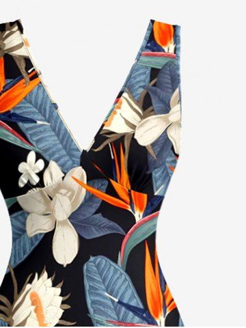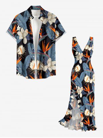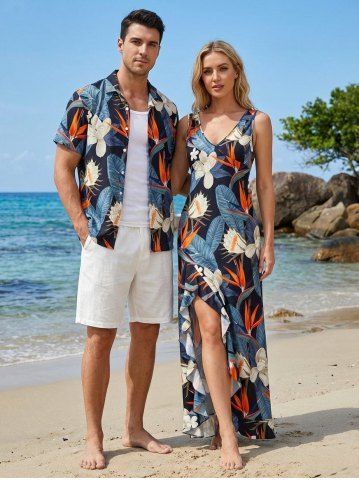 Tenues Hawaïennes Assorties> Tenue de plage assortie pour couples, imprimé fleurs et feuilles tropicales, style hawaïen