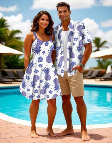 Tenues Hawaïennes Assorties> Tenue de plage hawaïenne assortie grande taille à imprimé ananas et hibiscus pour couples