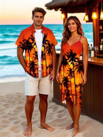 Tenues Hawaïennes Assorties> Tenue de plage hawaïenne assortie grande taille à imprimé cocotier et coucher de soleil ombré pour couples