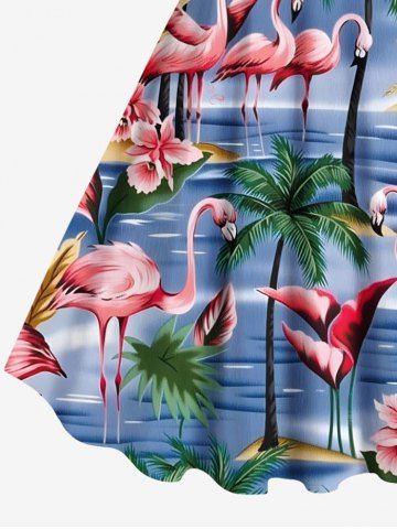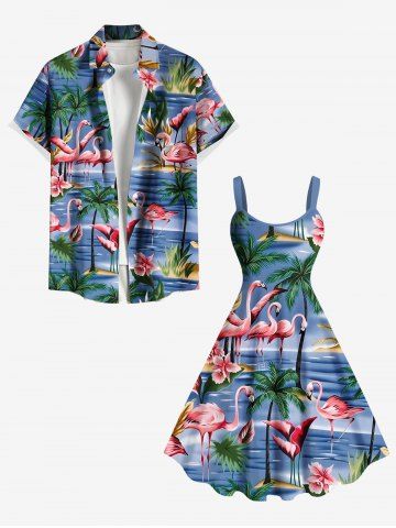 Tenues Hawaïennes Assorties> Tenue de plage hawaïenne assortie grande taille à imprimé cocotier, flamant rose et fleurs de mer pour couples