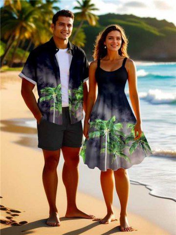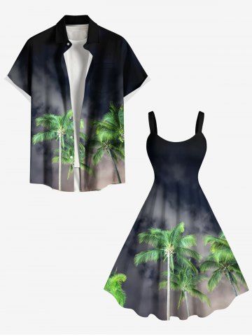 Tenues Hawaïennes Assorties> Tenue de plage hawaïenne assortie grande taille à imprimé cocotier ombré minuit pour couples