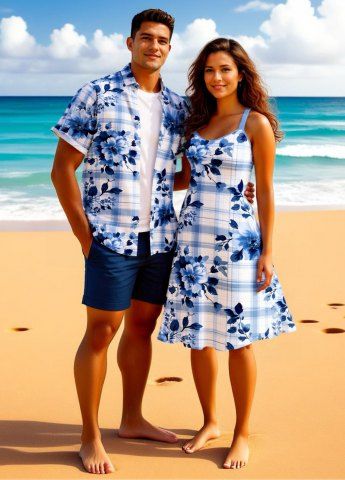 Tenues Hawaïennes Assorties> Tenue de plage hawaïenne assortie grande taille à imprimé écossais et fleurs de pivoine pour couples