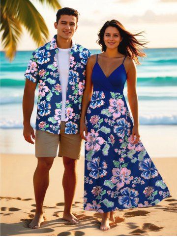 Tenues Hawaïennes Assorties> Tenue de plage hawaïenne assortie grande taille à imprimé feuilles et fleurs d'hibiscus pour couples