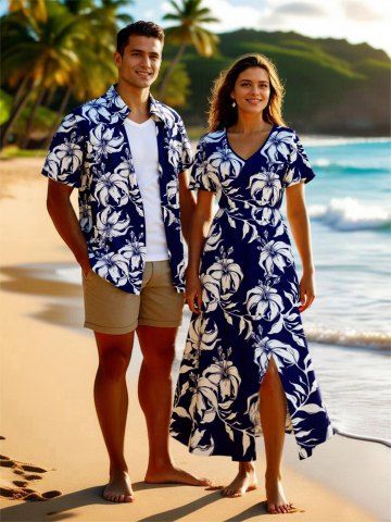 Tenues Hawaïennes Assorties> Tenue de plage hawaïenne assortie grande taille à imprimé feuilles et fleurs d'hibiscus pour couples