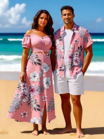 Tenues Hawaïennes Assorties > Tenue de plage hawaïenne assortie grande taille à imprimé feuilles tropicales et fleurs d'hibiscus pour couples