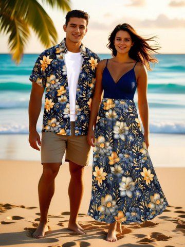 Tenues Hawaïennes Assorties> Tenue de plage hawaïenne assortie grande taille à imprimé fleurs et feuilles pour couples