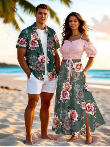 Tenues Hawaïennes Assorties> Tenue de plage hawaïenne assortie grande taille à imprimé floral et feuilles ombré pour couples