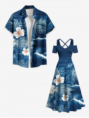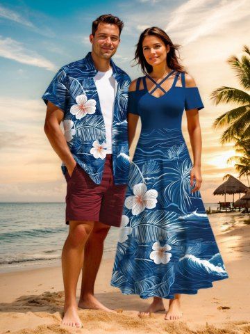 Tenues Hawaïennes Assorties> Tenue de plage hawaïenne assortie grande taille à imprimé tropical, motif hibiscus et fleurs marines, pour couples