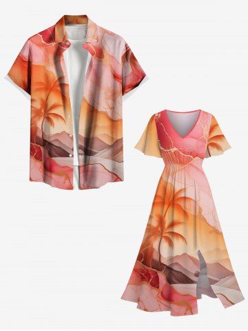 Tenues Hawaïennes Assorties> Tenue de plage hawaïenne assortie grande taille, motif ciel ombré, nuages, cocotiers, pour couples