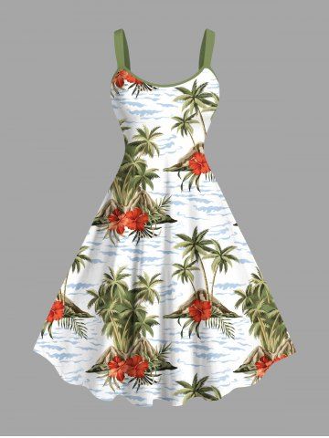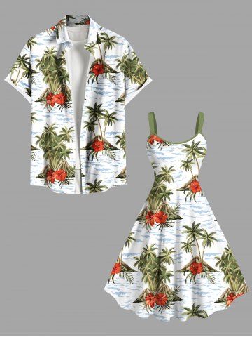 Tenues Hawaïennes Assorties> Tenue de plage hawaïenne assortie grande taille, motif cocotier, hibiscus, vagues de la mer, pour couples