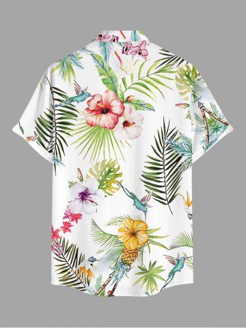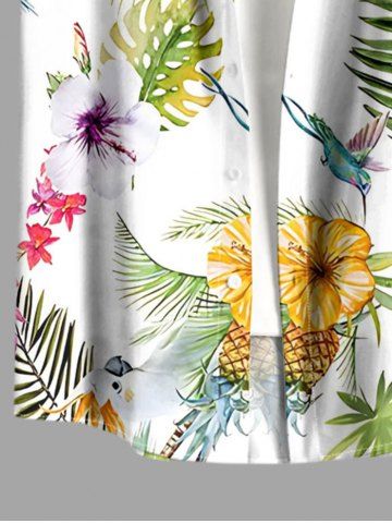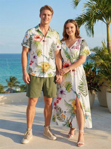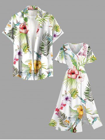 Tenue de plage hawaïenne assortie grande taille pour couples, avec fleurs d'hibiscus, feuilles tropicales, ananas et oiseaux - Blanc - Blanc