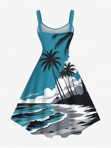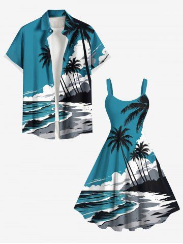 Tenues Hawaïennes Assorties > Tenue de plage hawaïenne assortie grande taille pour couples, imprimé vagues, cocotiers et paysage marin