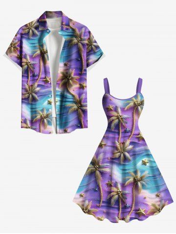 Tenues Hawaïennes Assorties> Tenue de plage hawaïenne assortie pour couples, grande taille, motif cocotier et étoile de mer ombré