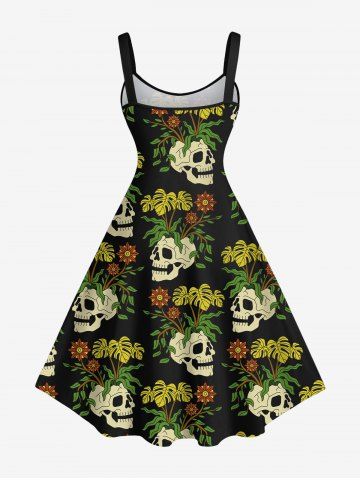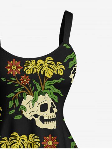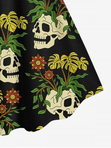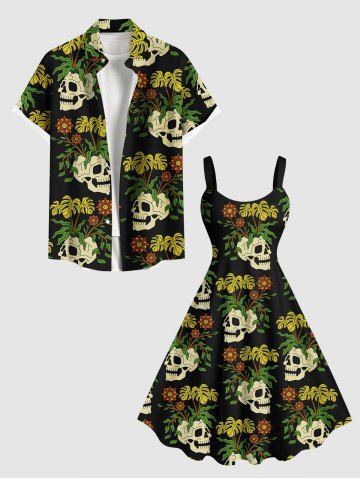 Tenues Hawaïennes Assorties> Tenue de plage hawaïenne assortie pour couples, grandes tailles, à imprimé de crânes, feuilles tropicales et fleurs