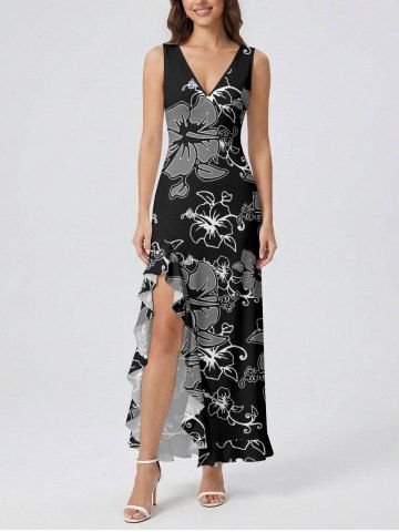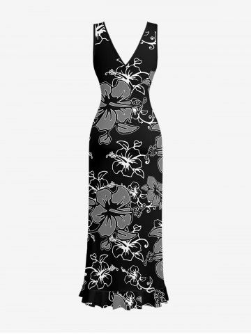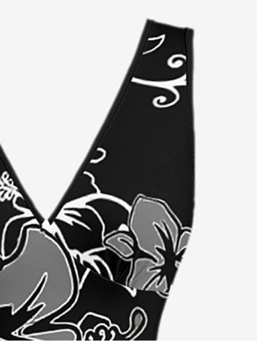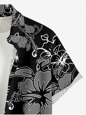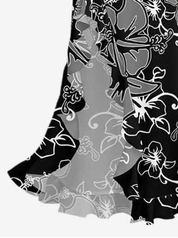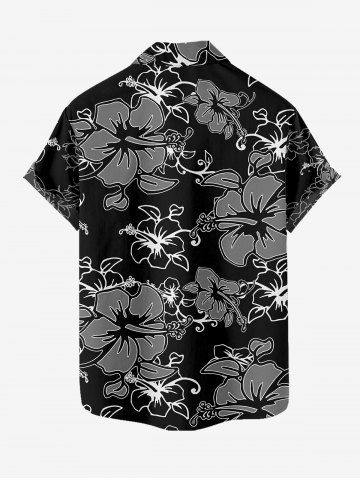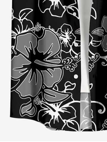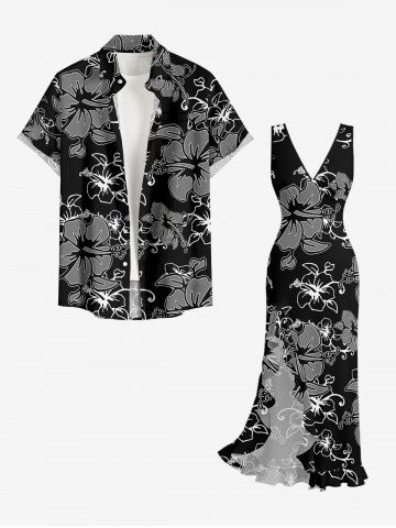 Tenue de plage hawaïenne assortie pour couples, imprimée de fleurs d'hibiscus et de feuilles - Noir - Noir
