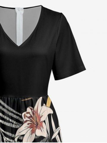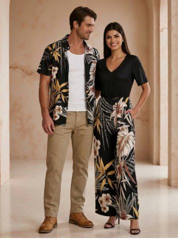 Tropical Leaf Flower Print Matching Hawaii Beach Outfit For Couples - Noir - Noir
