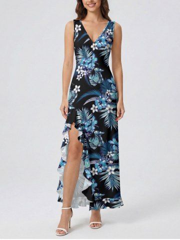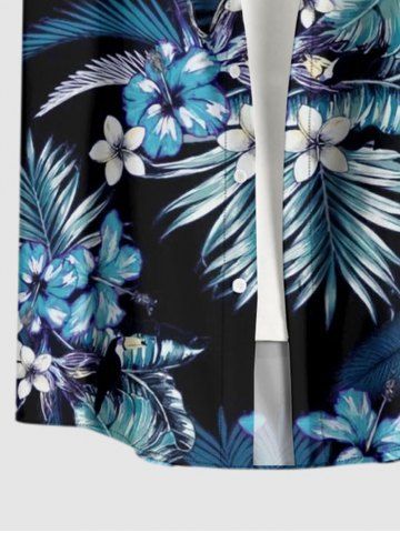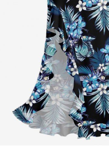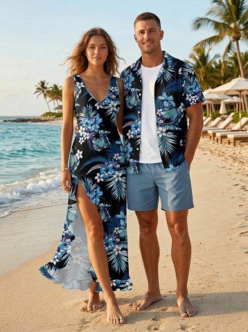 Tropical Leaf Hibiscus Flower Print Matching Hawaii Beach Outfit For Couples - Bleu - Bleu