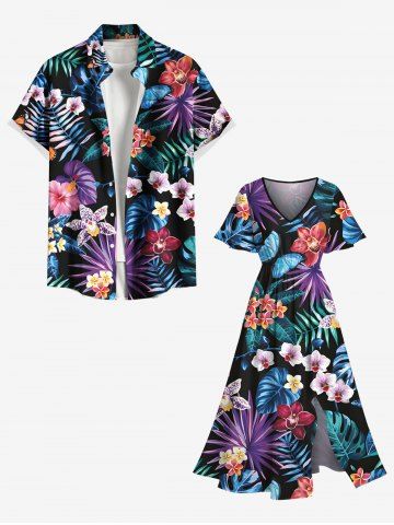 Tenues Hawaïennes Assorties> Tropical Leaf Hibiscus Flowers Butterfly Print Plus Size Matching Hawaii Beach Outfit For Couples