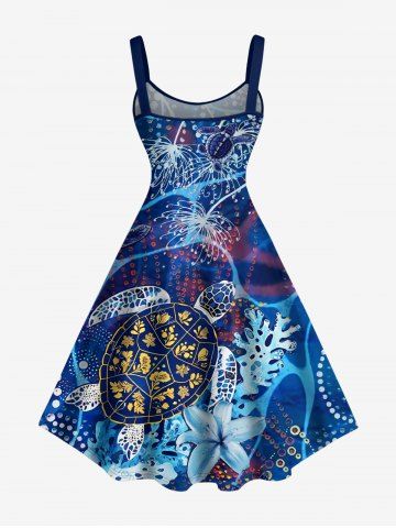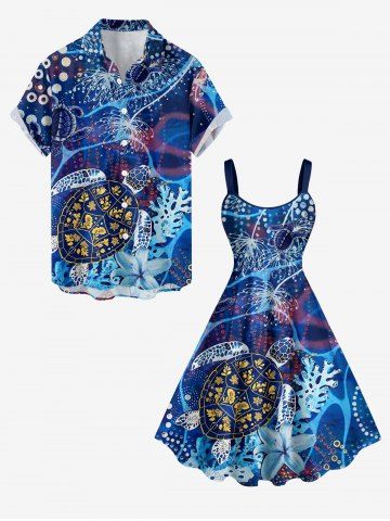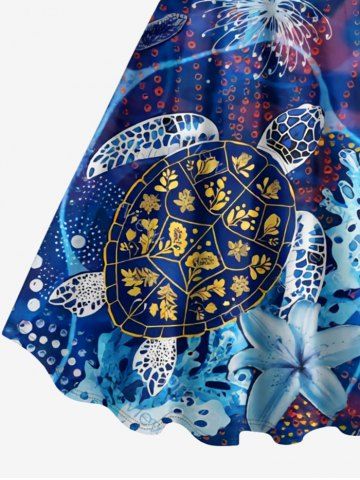 Turtle Coral Flower Print Plus Size Matching Hawaii Sea Creatures Beach Outfit For Couples - Bleu - Bleu