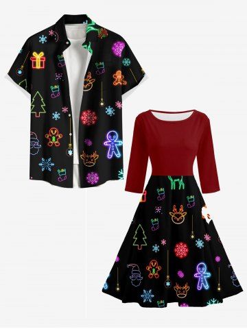 Tenus Assorties> Ensemble assorti pour couples : sapin de Noël pailleté, élan, flocons de neige et imprimé pain d'épice