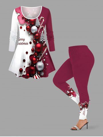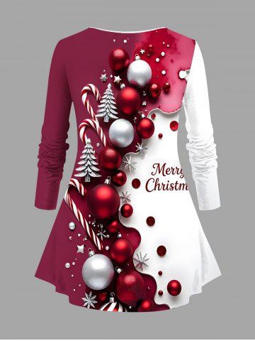 Plus Size Christmas Tree Ball Candy Colorblock Print Long Sleeves T-shirt - Rouge - Rouge