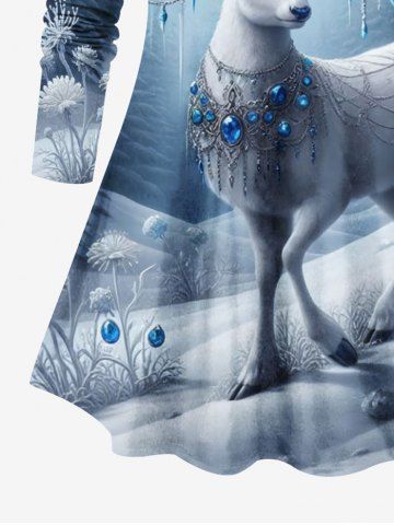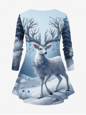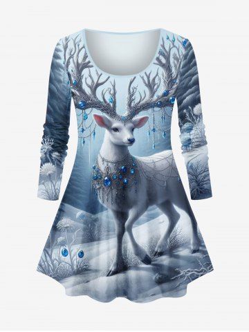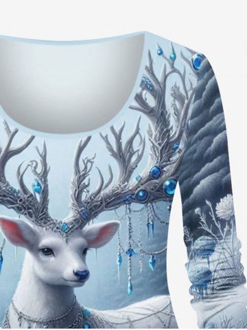 T-shirt à manches longues grande taille avec imprimé de fleurs et de cerfs de Noël - Bleu Ciel - Bleu Ciel
